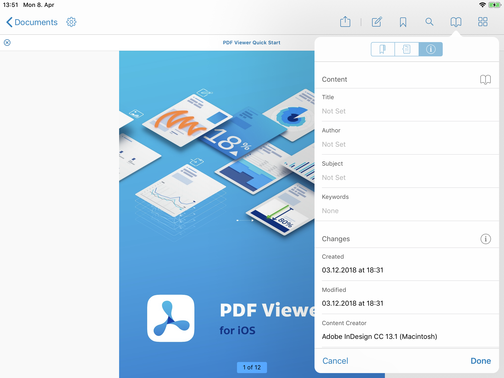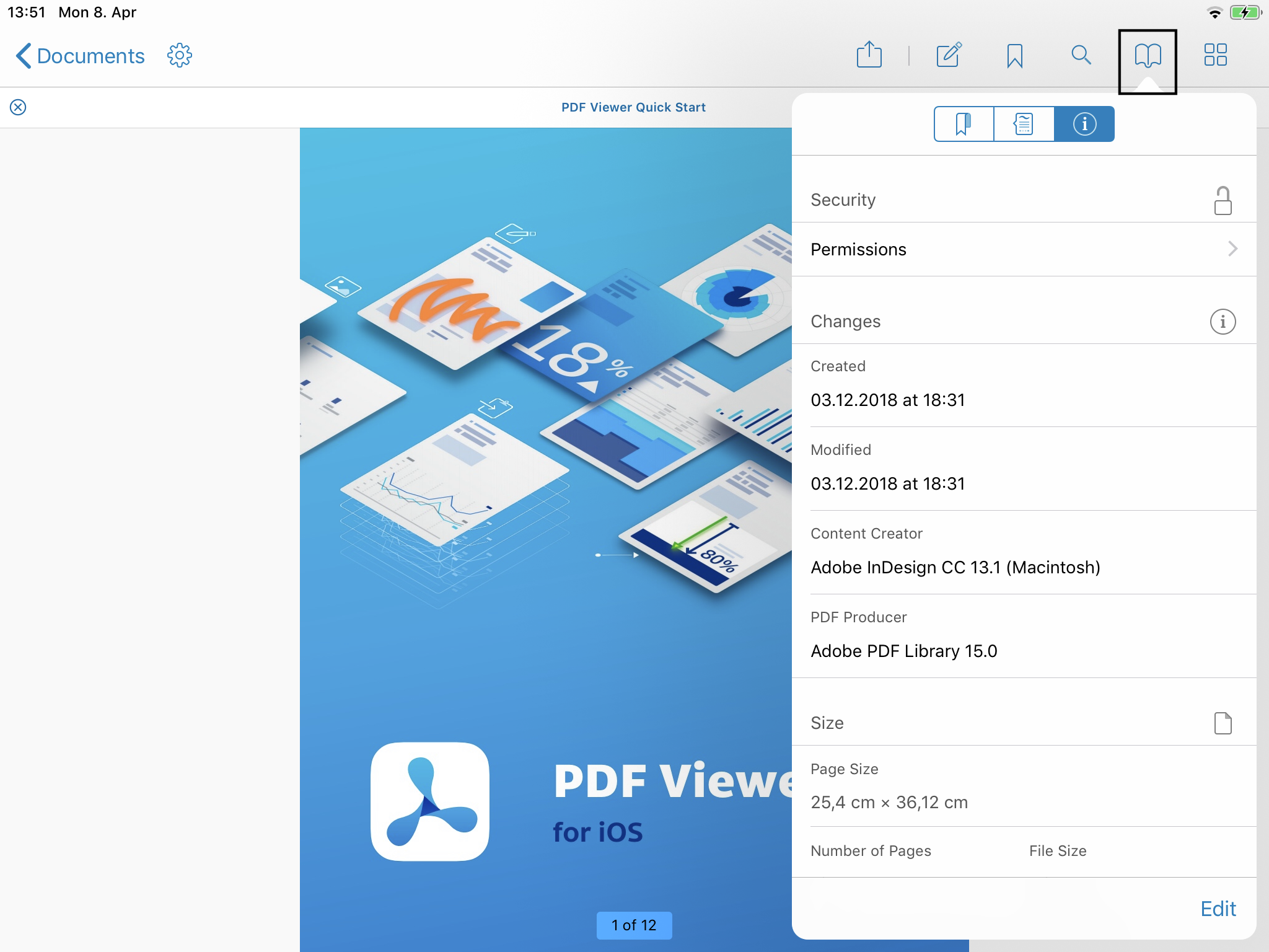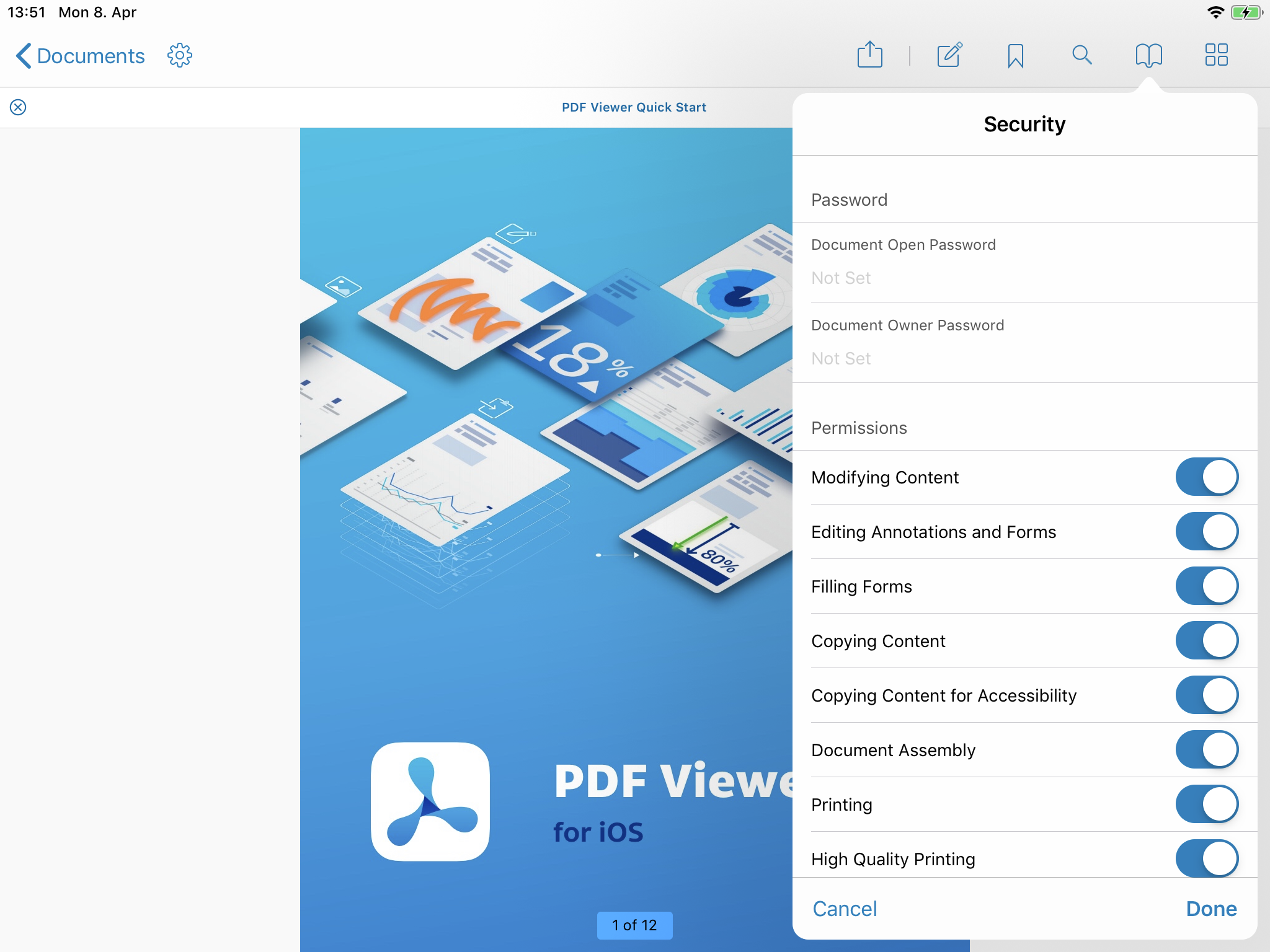 The Document Info View in PDF Viewer Pro for iOS, also allows you to securely encrypt your document with a password and set and change the document permission flags.