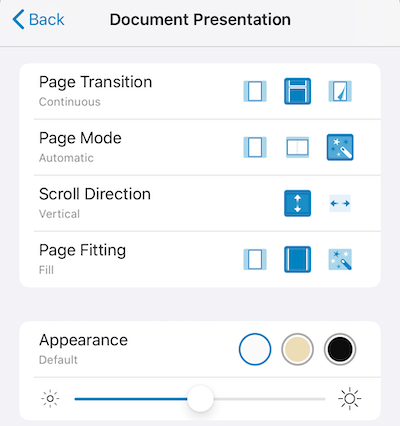Overview of the Document Presentation Settings in PDF Viewer for iOS.