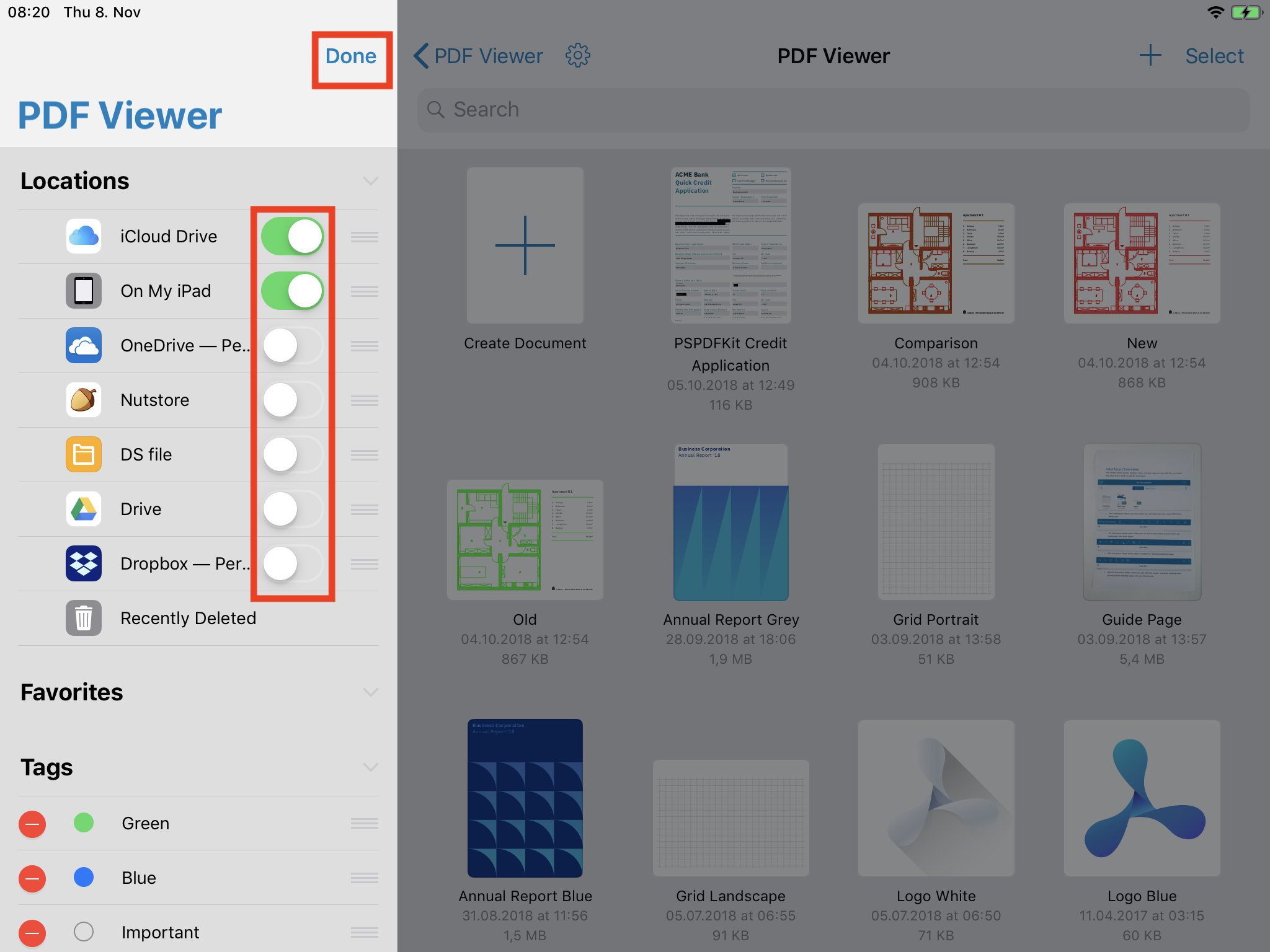 Now you can enable the apps you wish to have in the locations in PDF Viewer. Afterwards tap on the "Done" button to finish the action.