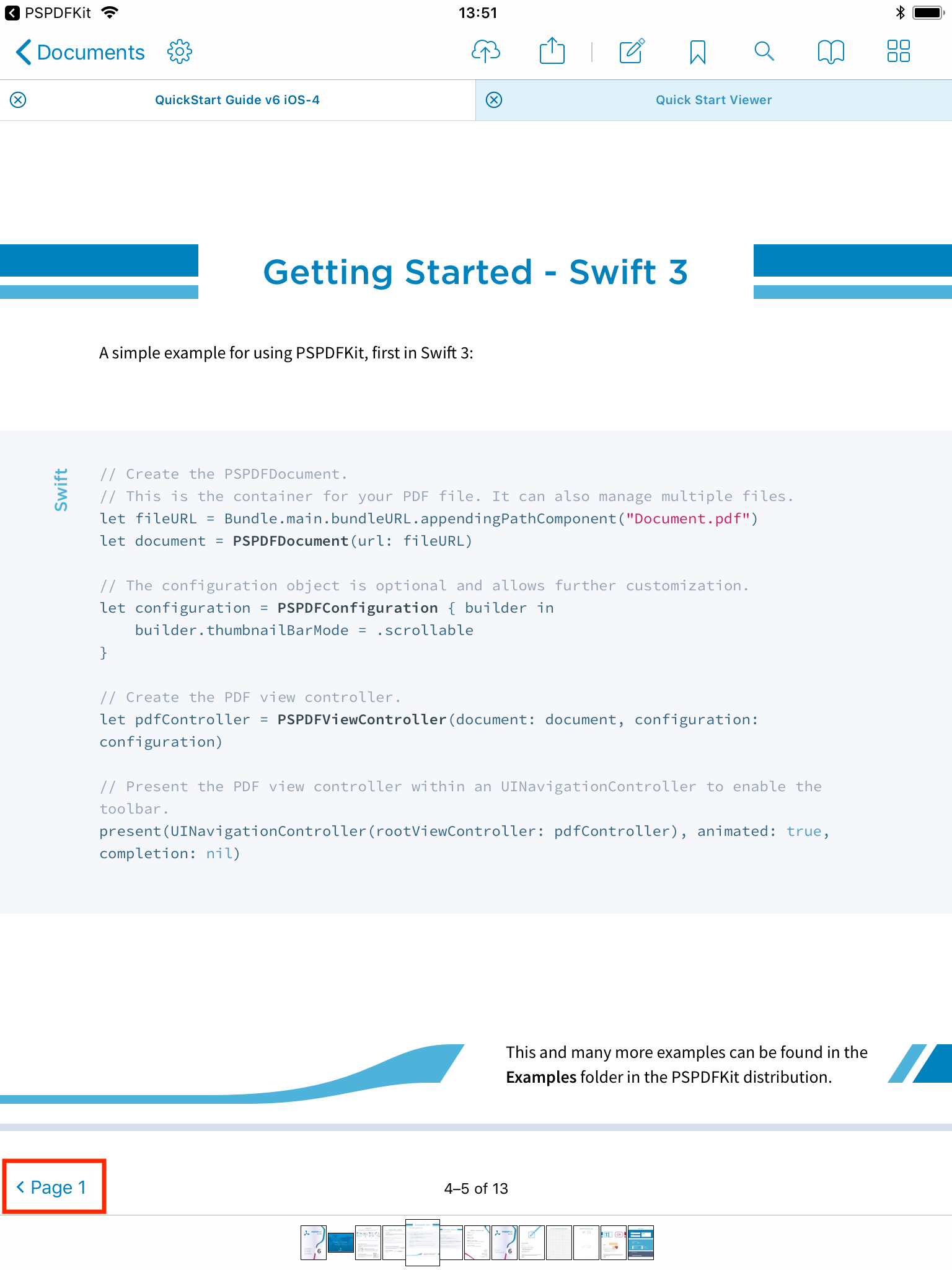 When tapping a link that sends you to another page in the document, an indicator appears in bottom left corner. Tap it to go back to the previous page.