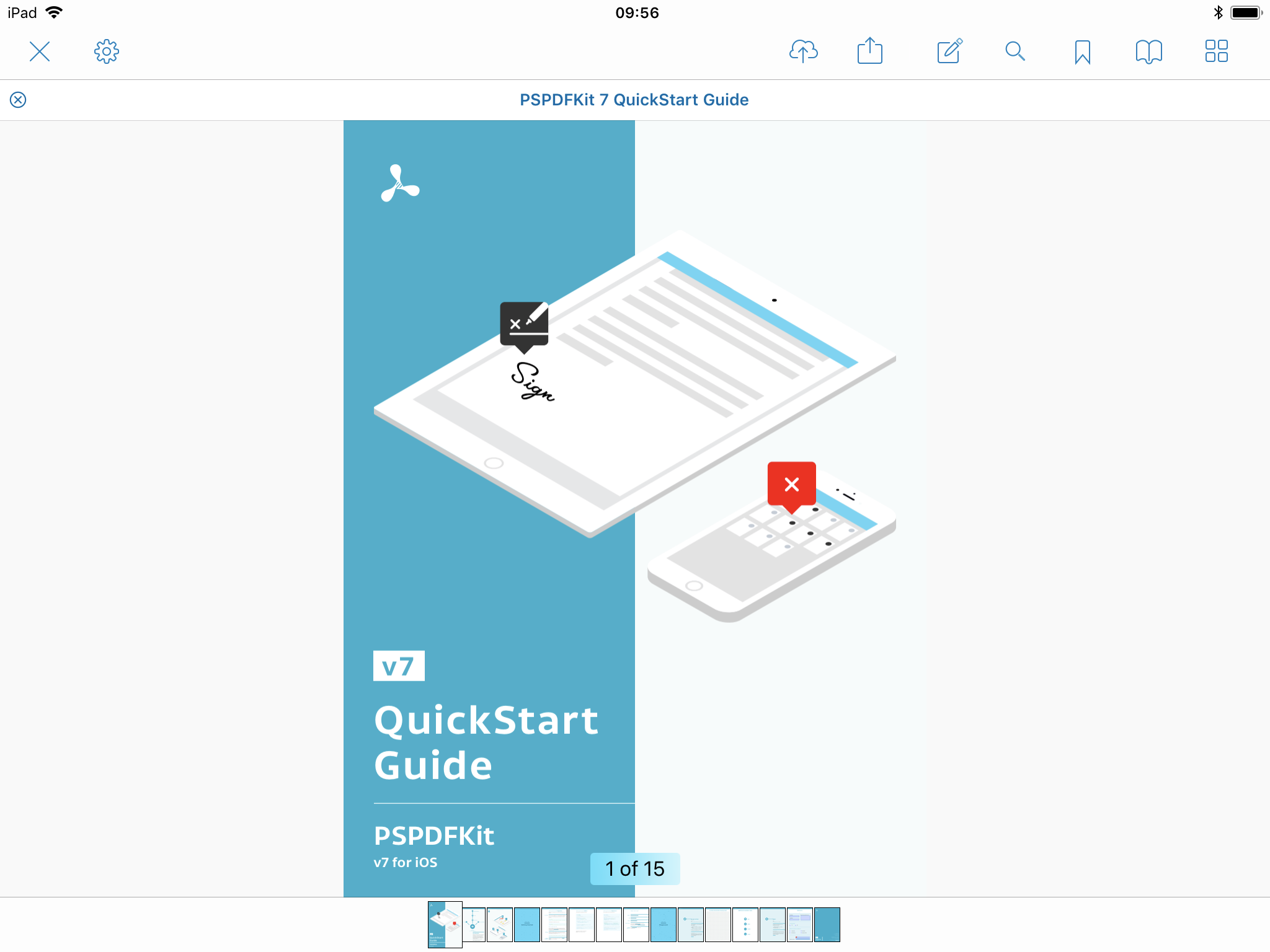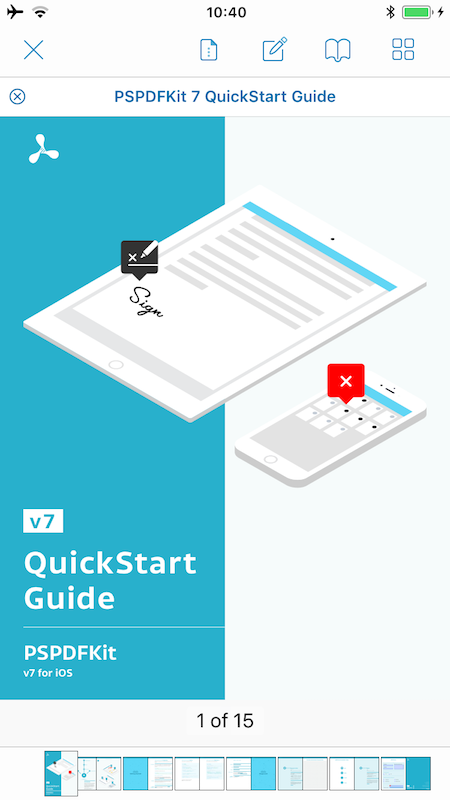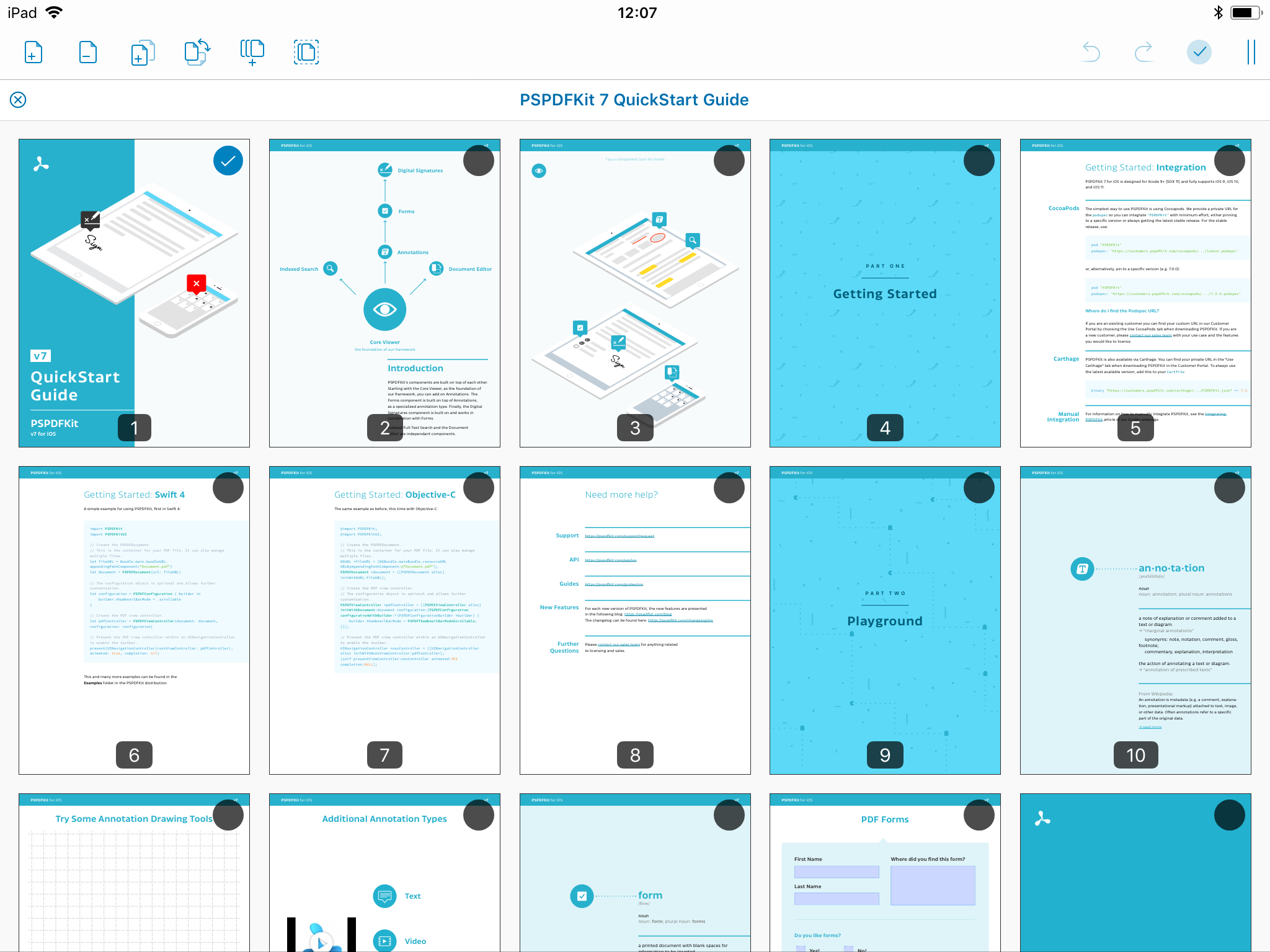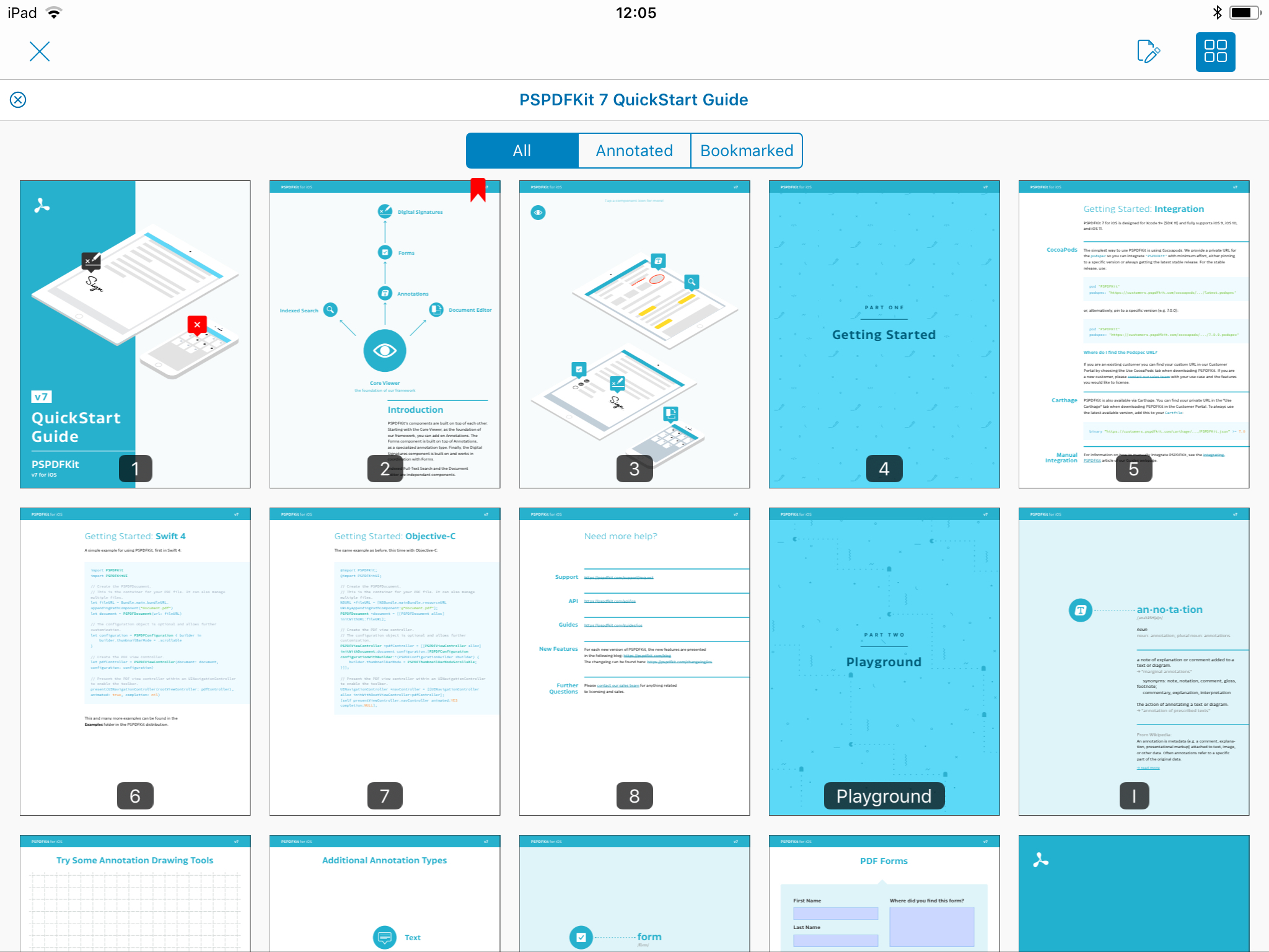 To enter the Thumbnail Grid View you have to tap on the Thumbnail Grid Button in the top toolbar as explained above. In there you can view all your pages very organized and also sort them to only display annotated or bookmarked pages. Tapping on a page will exit the Thumbnail Grid View and you will be back in the PDF Page View.