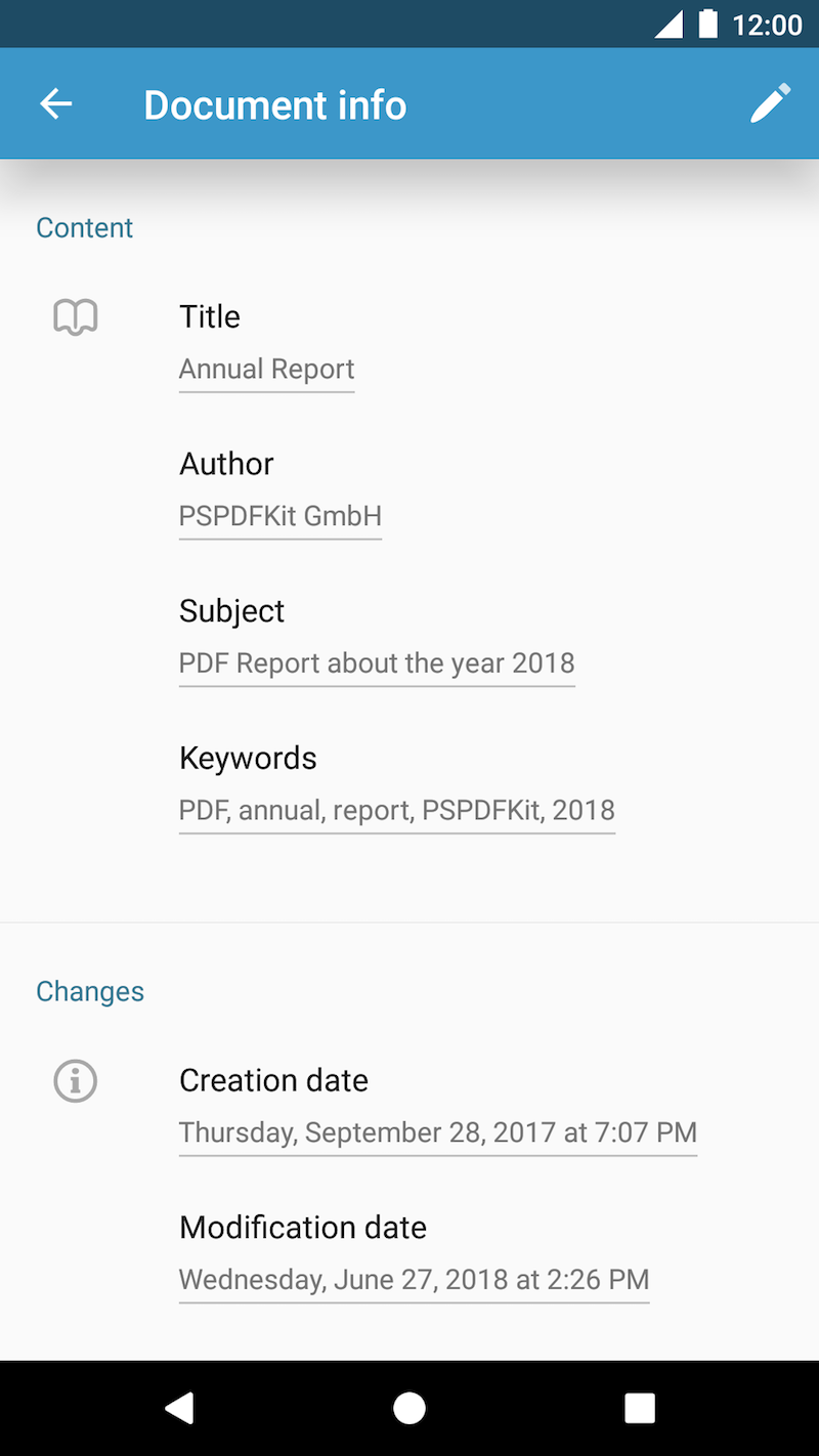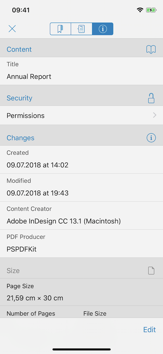 Your go-to place for viewing and editing all important document metadata, such as the document title, subject, keywords, size, and other characteristics. You can also securely encrypt your document with a password and set and change the document permission flags.