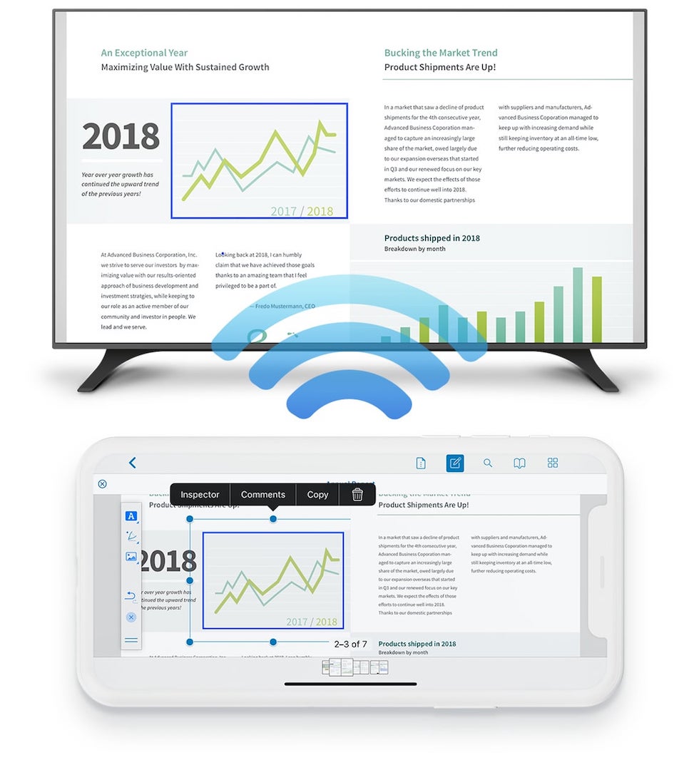 PDF Viewer can be a great tool for your presentations, allowing you to show off your PDF slides on a connected external display, projector, or AppleTV, directly from your mobile device. With PDF Viewer Pro, this experience is enhanced with a customized, clutter-free, presenter UI that mirrors your content in the native resolution of your connected external screen.